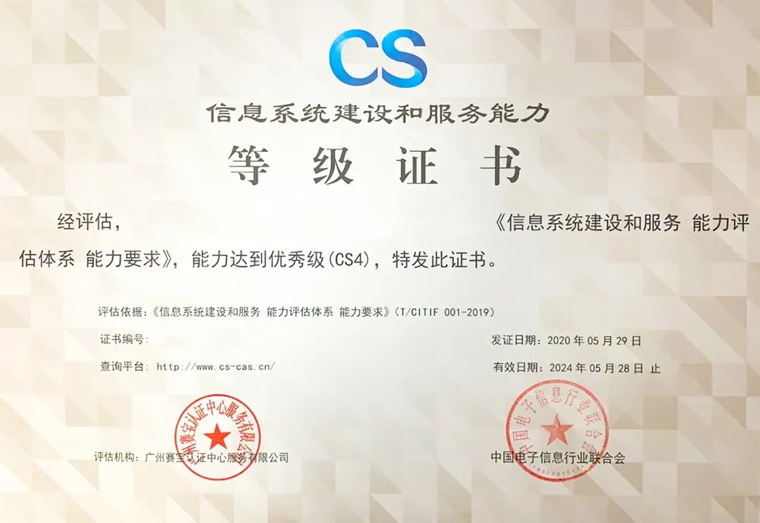 信息系统建设和服务能力划分为五个等级,从低到高分别用CS1、CS2、CS3、CS4、CS5级表示,并依次定义为初始级、基本级、良好级、**级和杰出级。证书有效期为4年。